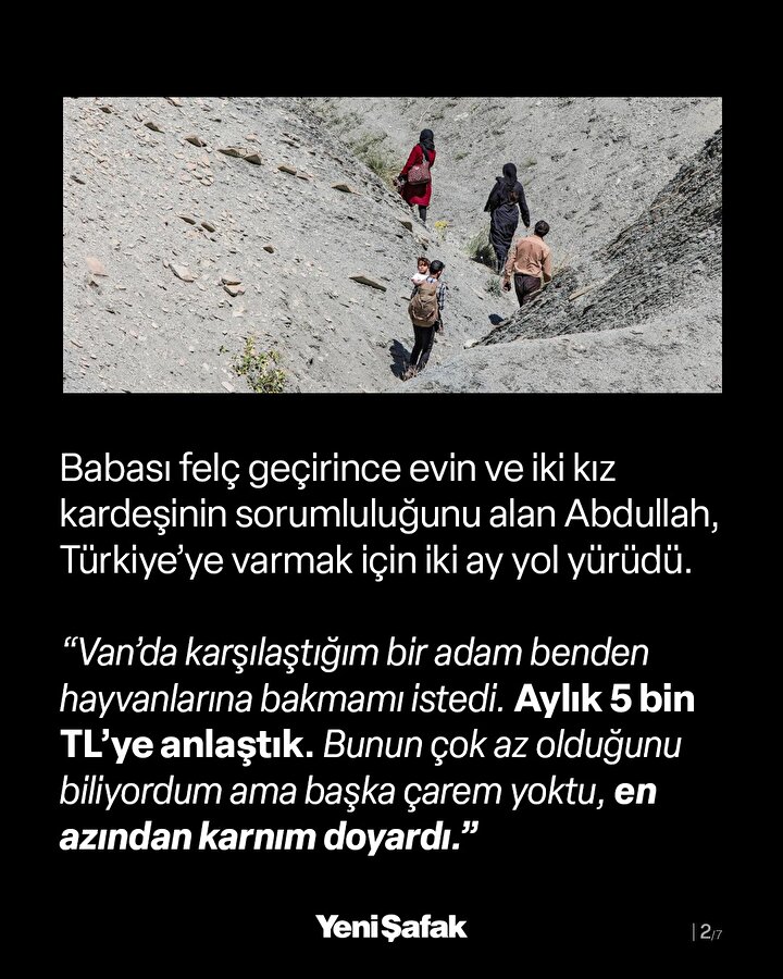 Babası felç geçirince evin ve iki kız kardeşinin sorumluluğunu alan Abdullah, Türkiye’ye varmak için iki ay yol yürüdü. “Van’da karşılaştığım bir adam benden hayvanlarına bakmamı istedi. Aylık 5 bin TL’ye anlaştık. Bunun çok az olduğunu biliyordum ama başka çarem yoktu, en azından karnım doyardı.”