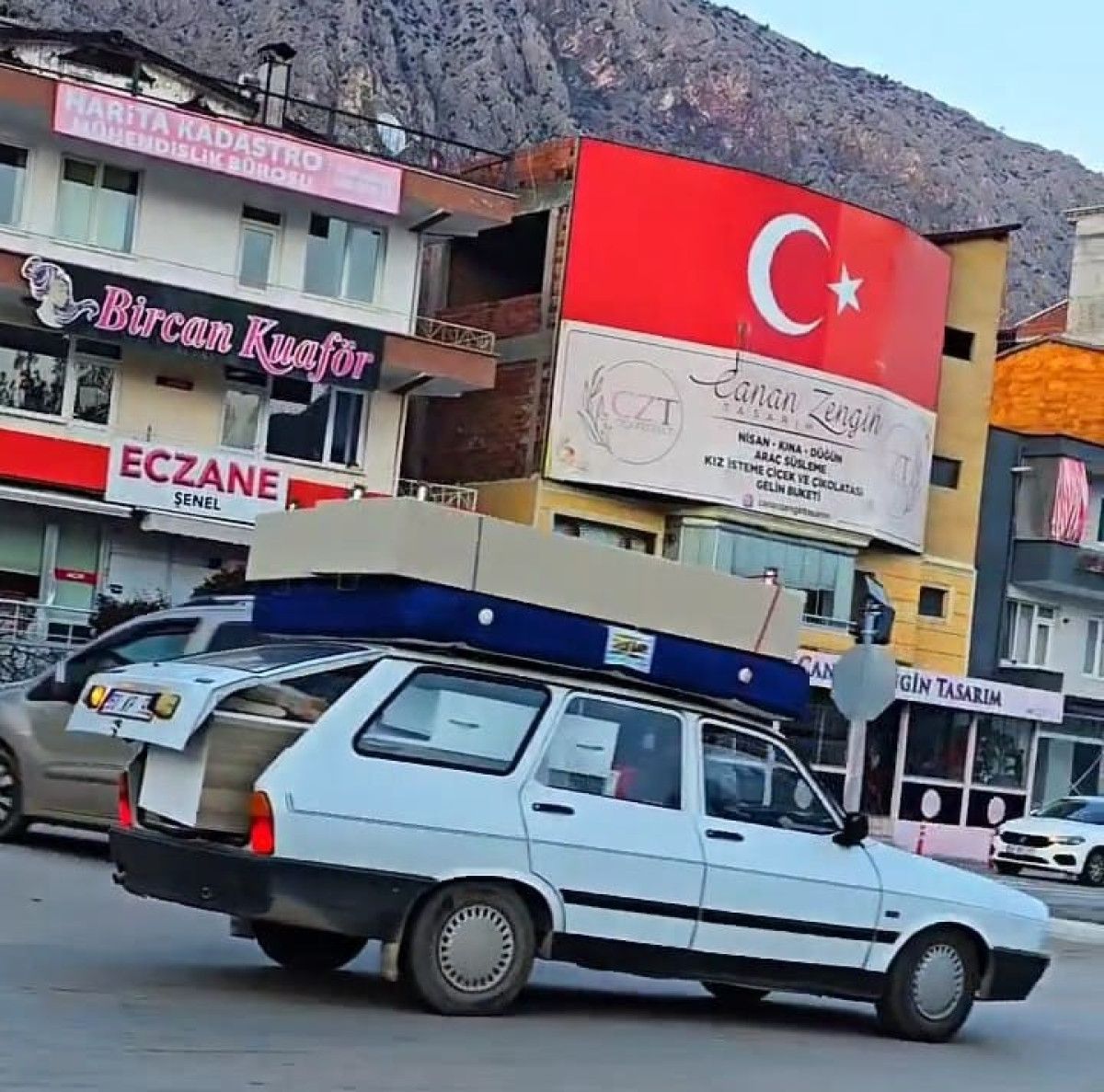 Amasya merkez Şeyhcui Mahallesi’nde otomobilinin tavanında çift kişilik baza ve yatak taşıyan sürücü, tehlikeye aldırış etmeden trafikte ilerledi.