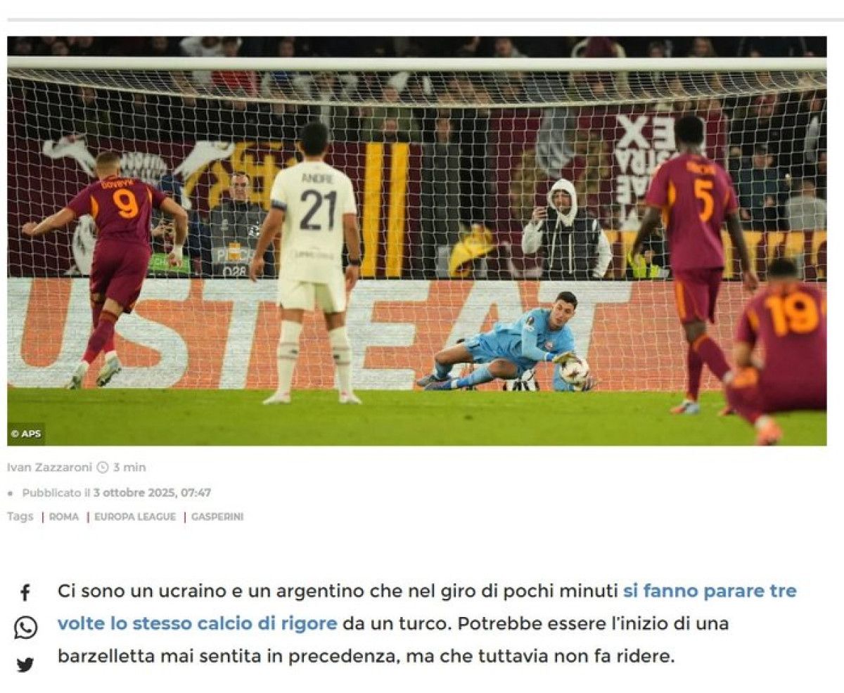 İtalyan gazetesi La Gazzetta dello Sport da, “Aynı maçta, hatta aynı pozisyonda 3 penaltı kaçırmak. Tarihe geçecek bir manzara. Lille için beklenmedik bir şov, Romalılar için ise tam bir kabus. İlk iki penaltı kaleci çizgiyi erken terk ettiği için tekrarlandı, vuruşlar zaten unutulmaz değildi. 3. de Berke Özer’in çıkışı tamamen kurallara uygundu. 4. deneme olsaydı ne olacağını düşünmek bile istemezsiniz.” değerlendirmesinde bulundu.