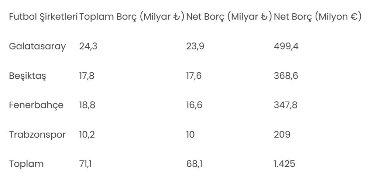 Buna göre Galatasaray’ın 23,9 milyar lira, Beşiktaş’ın 17,6 milyar lira, Fenerbahçe’nin 16,6 milyar lira ve Trabzonspor’un 10 milyar lira olmak üzere 4 kulübün toplam 68,1 milyar liralık (1,42 milyar euro) net borcu bulunuyor.
